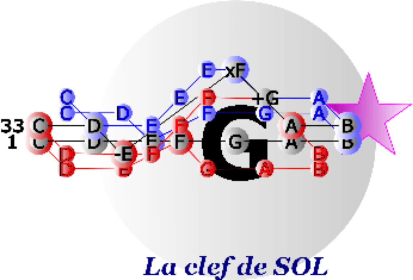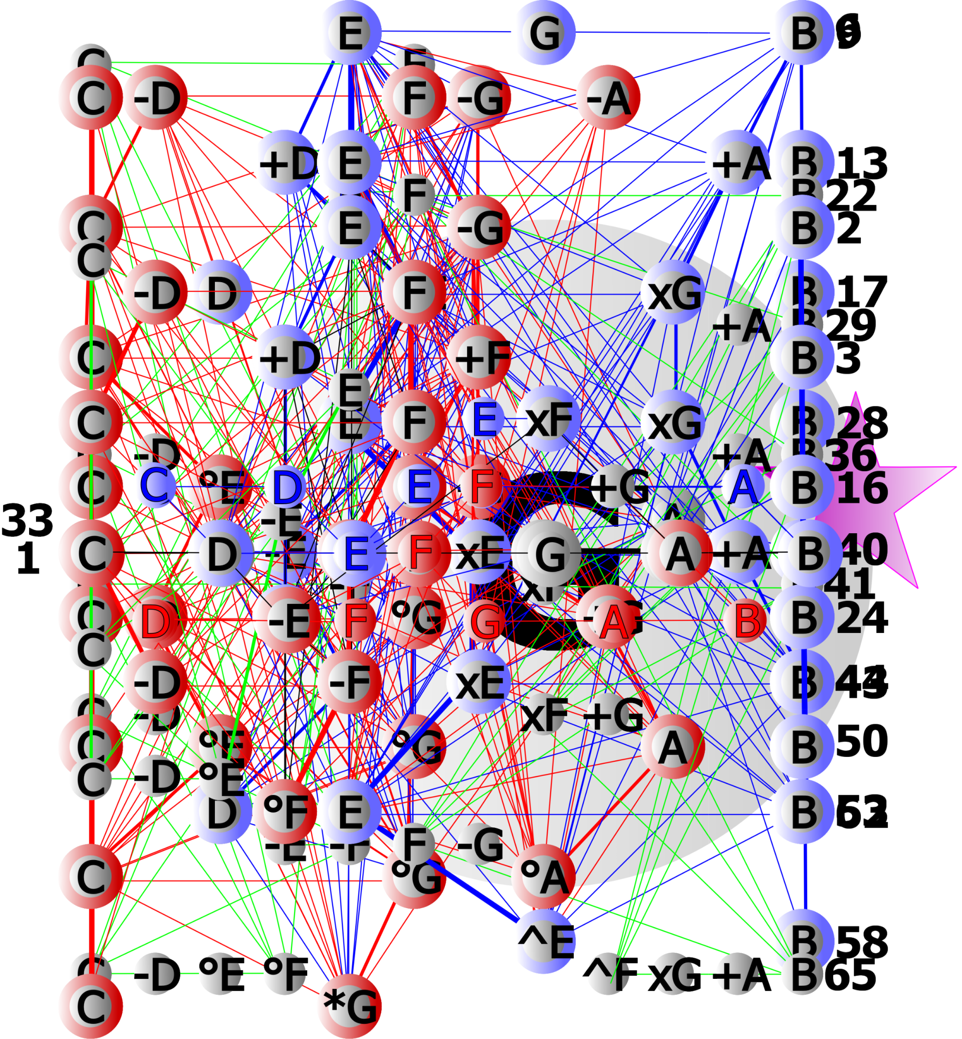 Finalement, si comme moi, vous connaissez le sujet, cette page développe un nombre de caractéristiques éloquentes. Les couleurs des notes altérées, ainsi que de leurs fonctions qui par domination démontre la transformation des valeurs toniques. Les gammes ne sont pas égales et les groupes regroupent des inégalités. Tous les plus ou moins chromatiques colorés nous donnent les amplitudes. Tous sur un décor de fond, où se diffusent les axes de résonances, eux aussi colorisés selon leurs appartenances. L’image en deux dimensions est le premier pas vers la troisième dimension, et une quatrième qui sera la densité des flux….