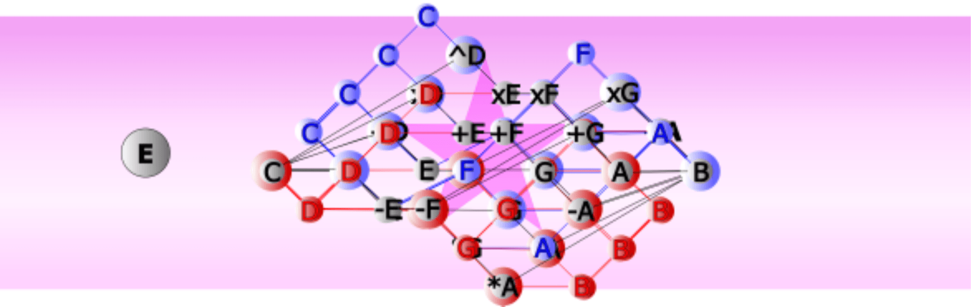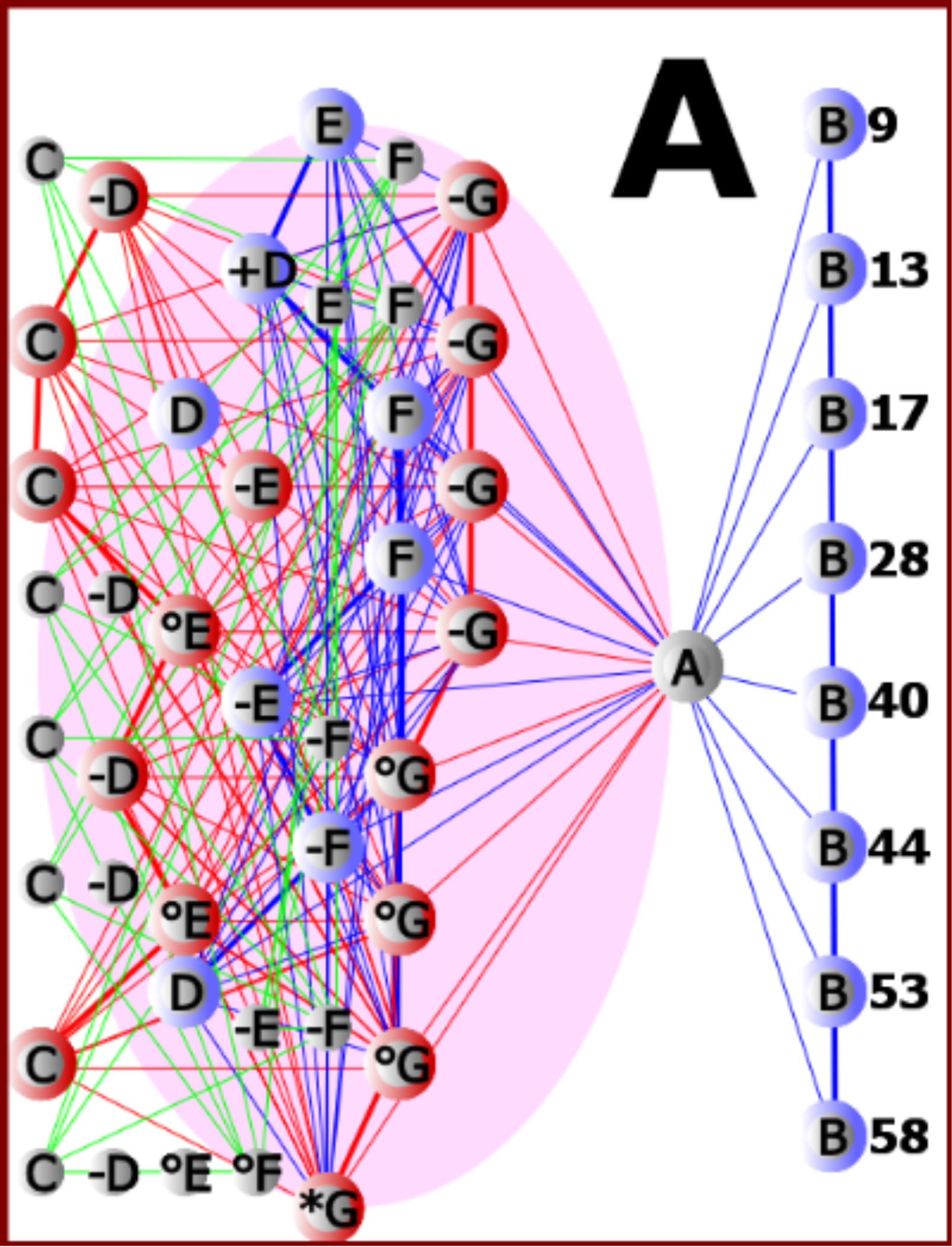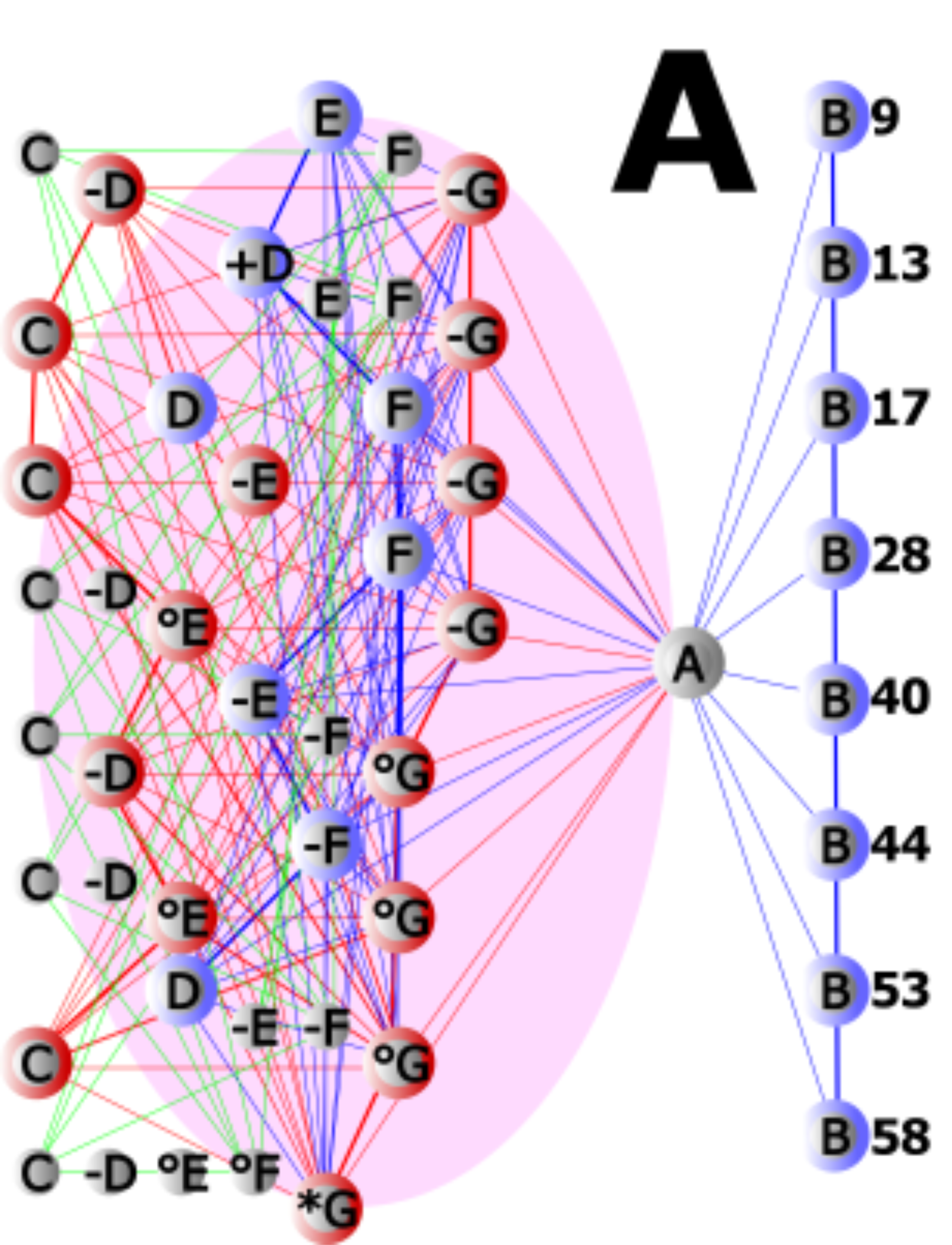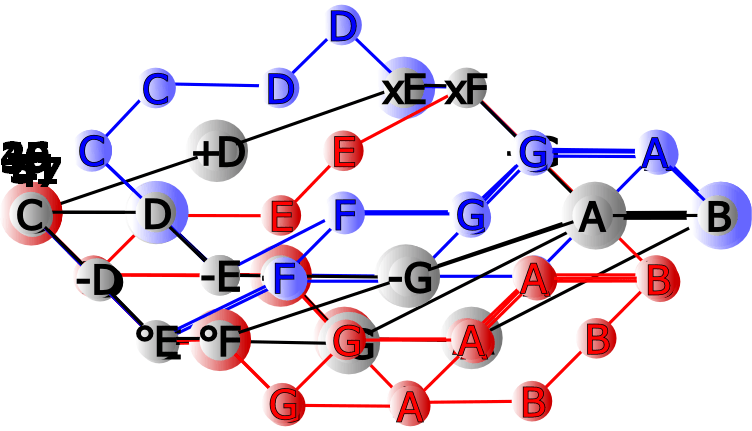 La majeure partie des gammes se regroupent en plusieurs groupes, sauf deux cas à part. La motivation du groupe est de réunir les toniques, ce qui a pour effet de produire de la résonance. C’est ce qui se produit lorsque deux systèmes harmoniques se choquent, aussi une gamme qui est une relative tonique possède une résonance proprement liée. La gamme majeure, n’ayant aucun lien tonique (nœud DGA), n’est pas dans un groupe. Puis, la gamme -34x et son absence totale tonique majeure, et non en groupe. En juxtaposant ces deux modèles uniques, la note SOL devient une tonique dominante. Malgré le fait que la note SOL est relative à la résonance, il y a là une partie de la masse diatonique qui est au centre des deux gammes sans la résonance de groupe. Il y a bien aussi, des résonances courantes parmi les courants chromatiques… 8^)