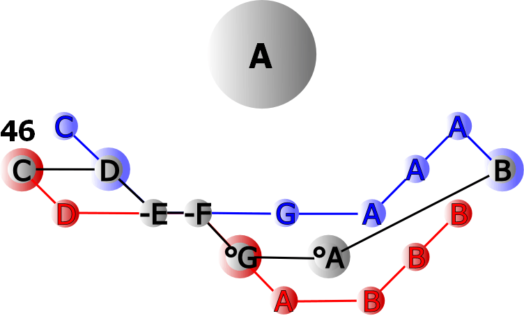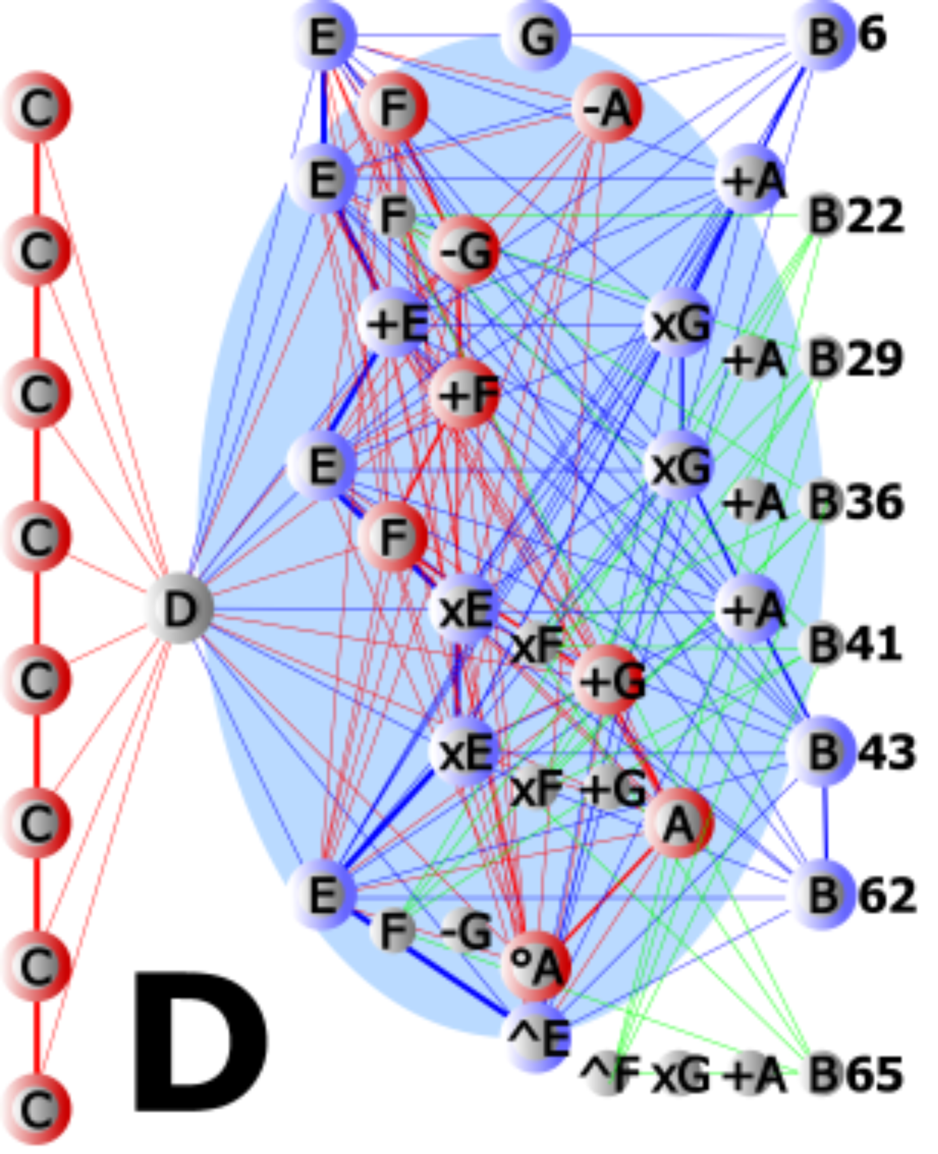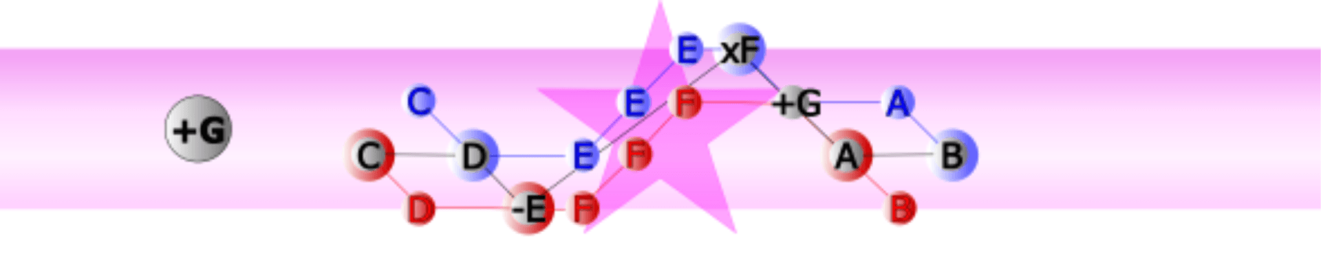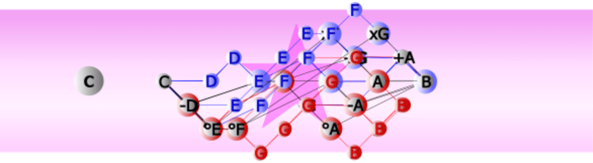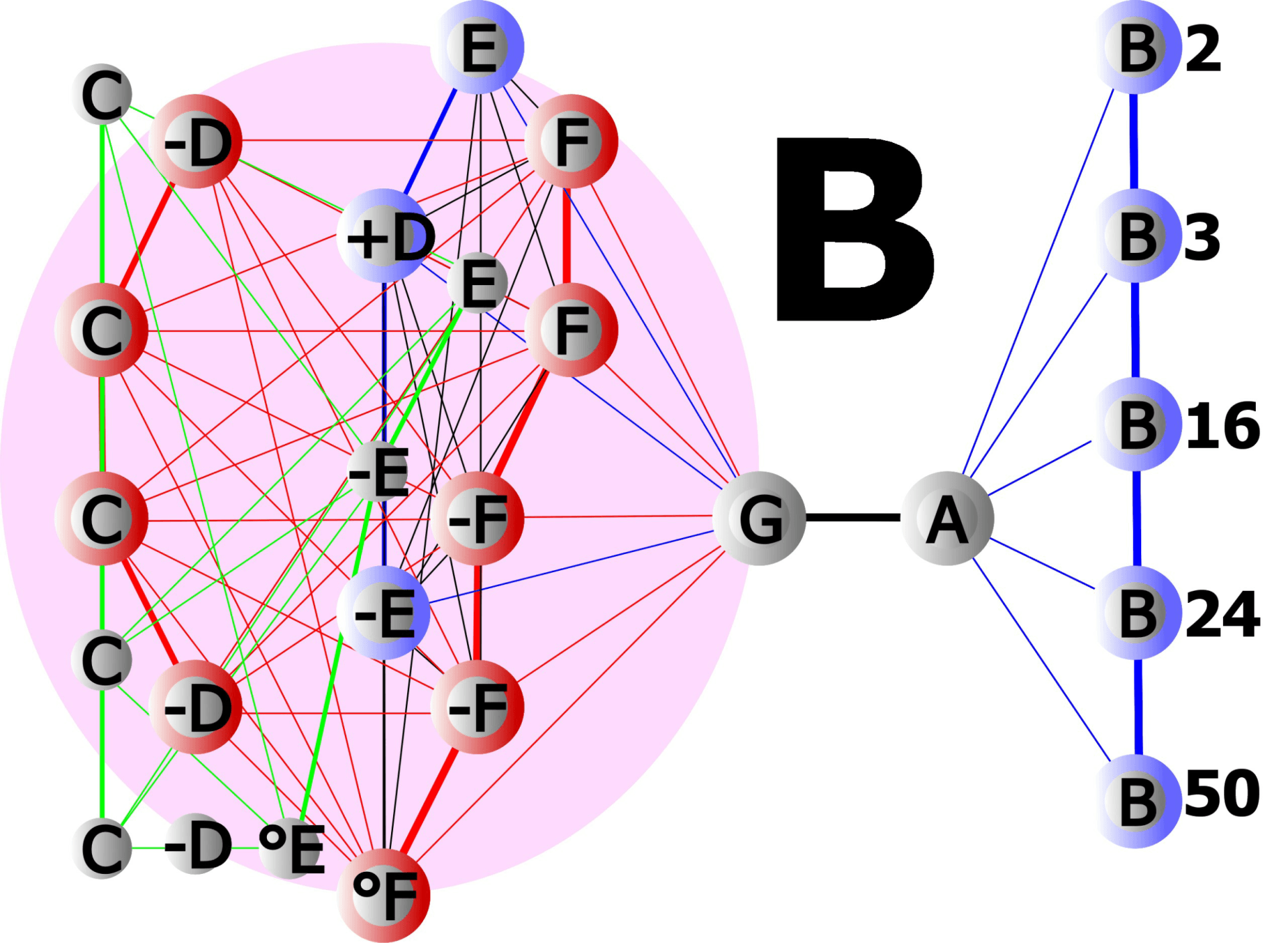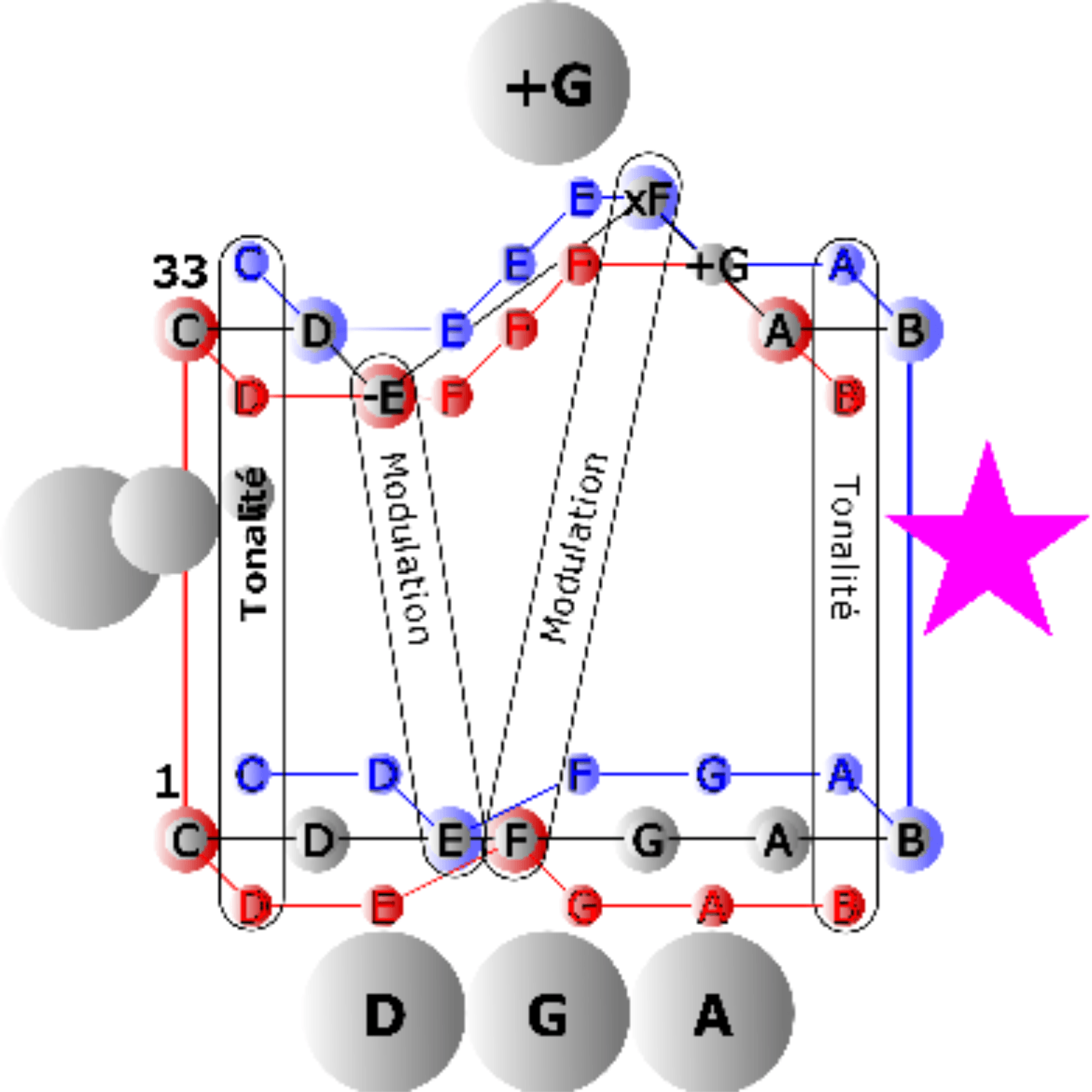 Les différents groupes sont à la chaîne, le pôle B est en liaison harmonique avec le pôle A. Ces deux pôles forment une union supérieure, et le pôle B de médiante diminuée en contact de voisinage au pôle D. À cause de sa mélodique augmentée, qui force le contact en repoussant la médiante voisine.