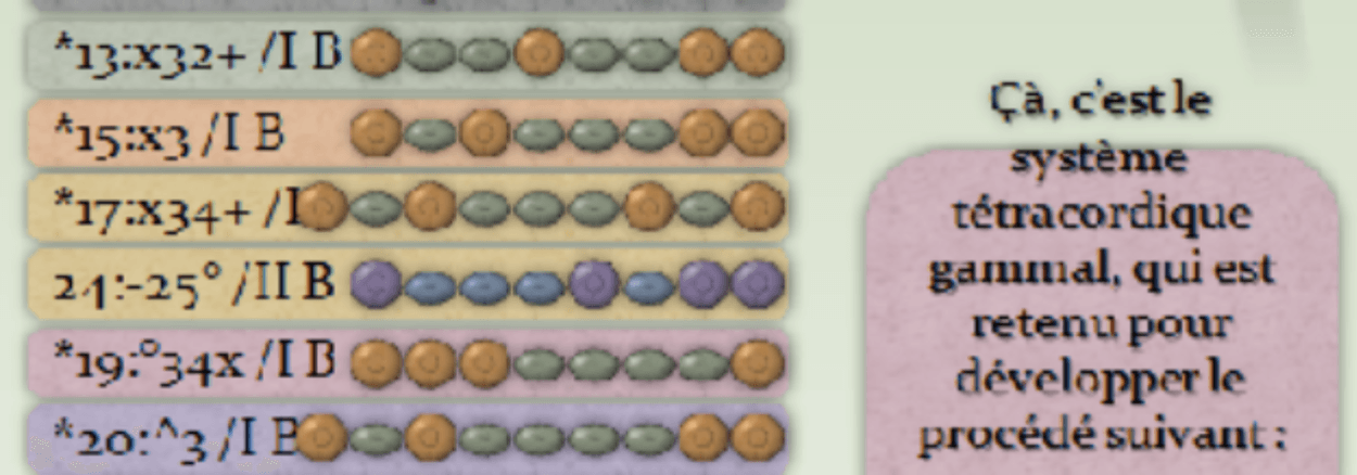 Parmi les tétracordes, il y a des éléments originaux. Des éléments clefs, tels le n°1 et le n°14, ils sont tous deux représentatifs des harmoniques en développant une diatonique invariable ou constante.