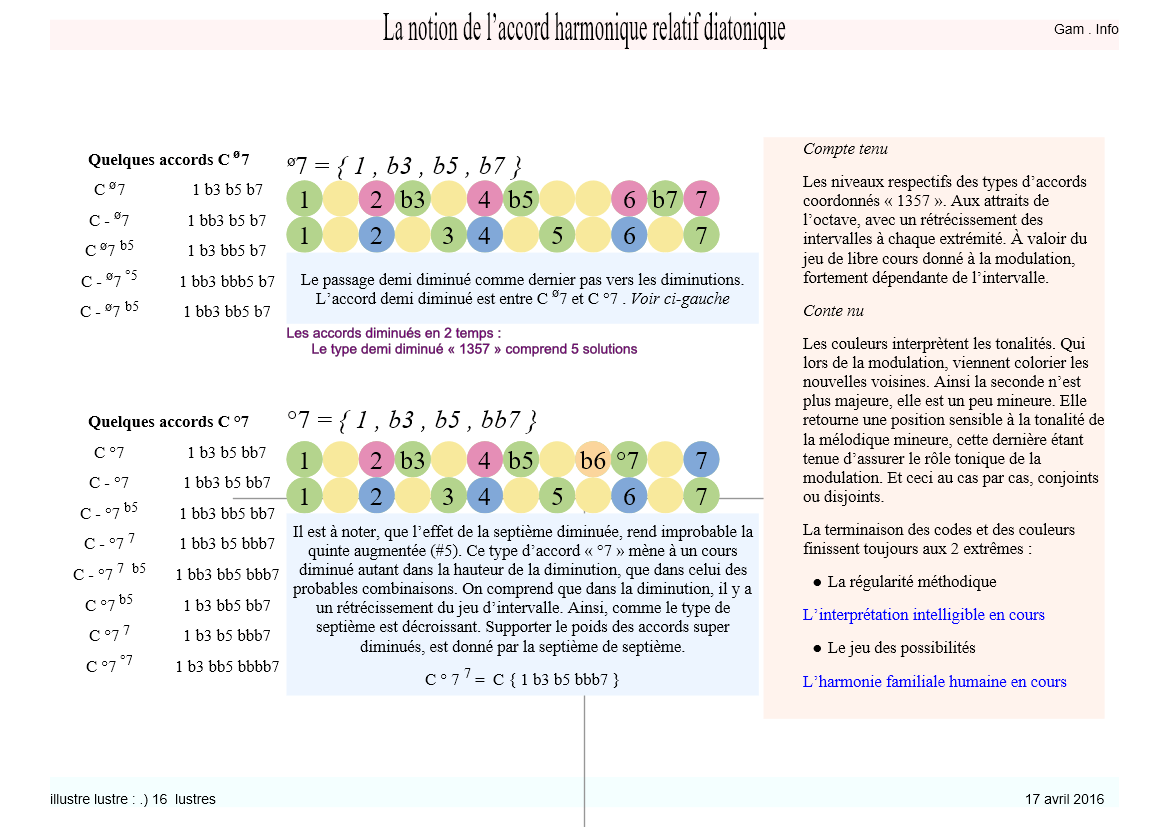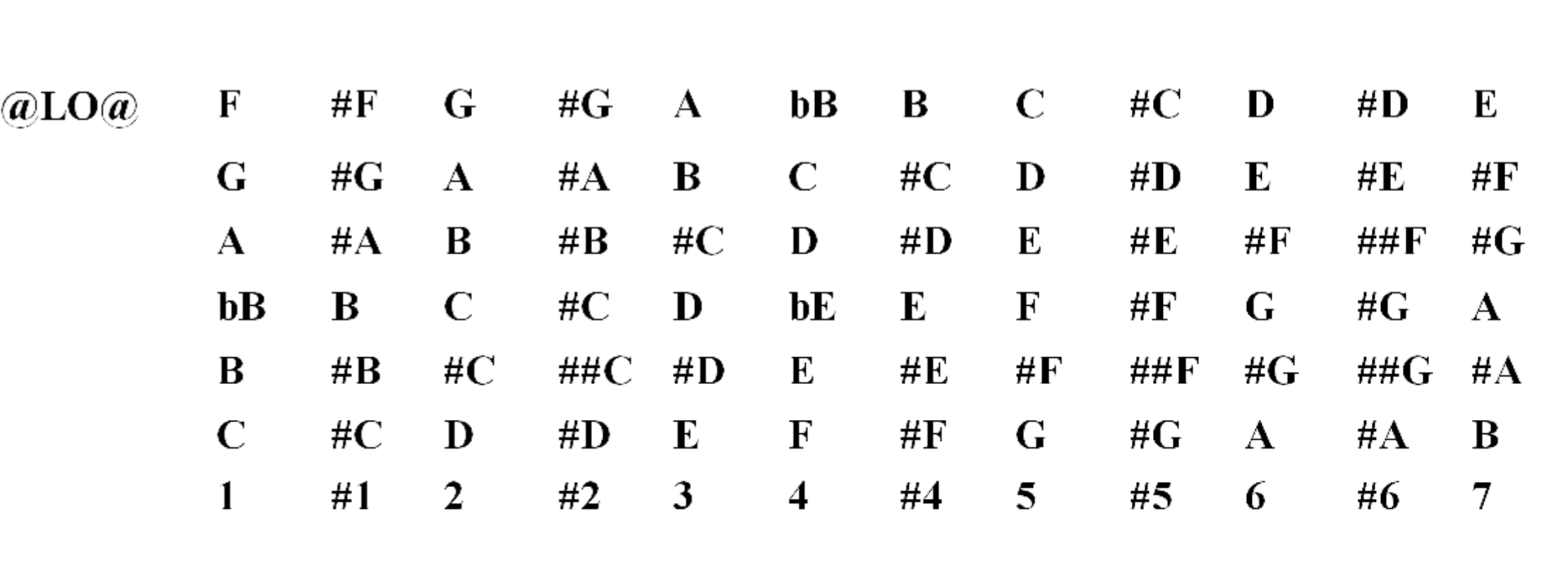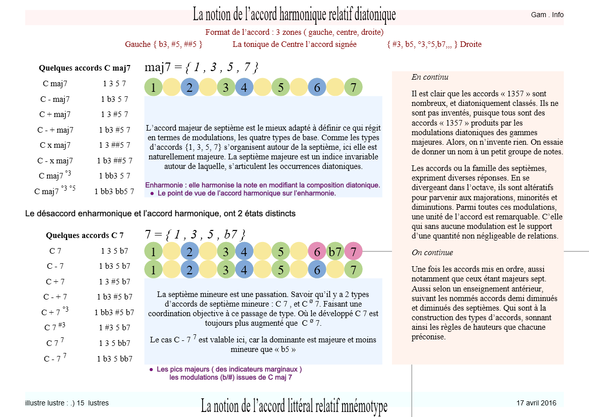 Effet de gamme, avec plein de notes. Le contraste détermine la nature gammale Gammes mélodiques de, C - mj 7 à la note SI, on rencontrera la note de MI bémol. De, C-mj 7 + à Bø7, ... on voit b3 & #5. Gammes tonales en miton, Cmj7, bD-mj7, E-(°7), Fmj7, G7b5, A-7 et B-ø7. En tri-miton, Cmj7, #D-°7, E-mj7, Fmj7, G+7, A-7 et B7b5. Gammes dominantes (: C, D, E, F, bG, A, B :) & son accord, bG+mj7#3. Gammes harmoniques augmentées, en Cmj7 a la nuance du #A-°7.