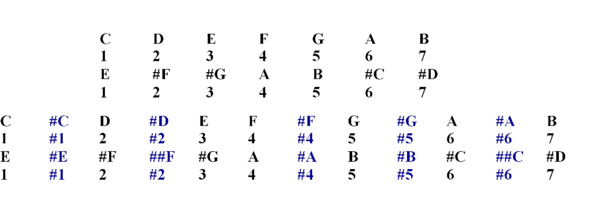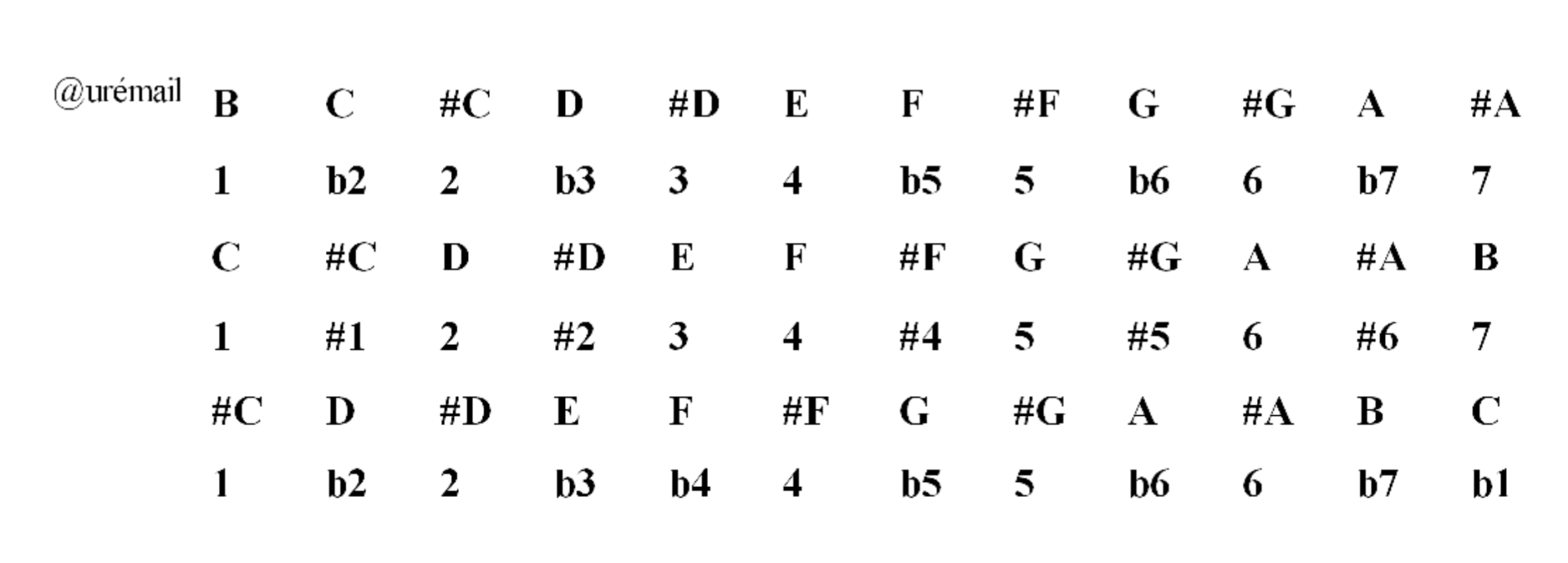 En développant les gammes chromatiques majeures (b, #) de DO (C), on remarque que la formule du septième degrés (SI (B)) côté dièse, est identique à la formule du premier degré (DO(C)) côté bémol. En ayant, bien entendu, commencé par l'ordre des bémols (voir figure),