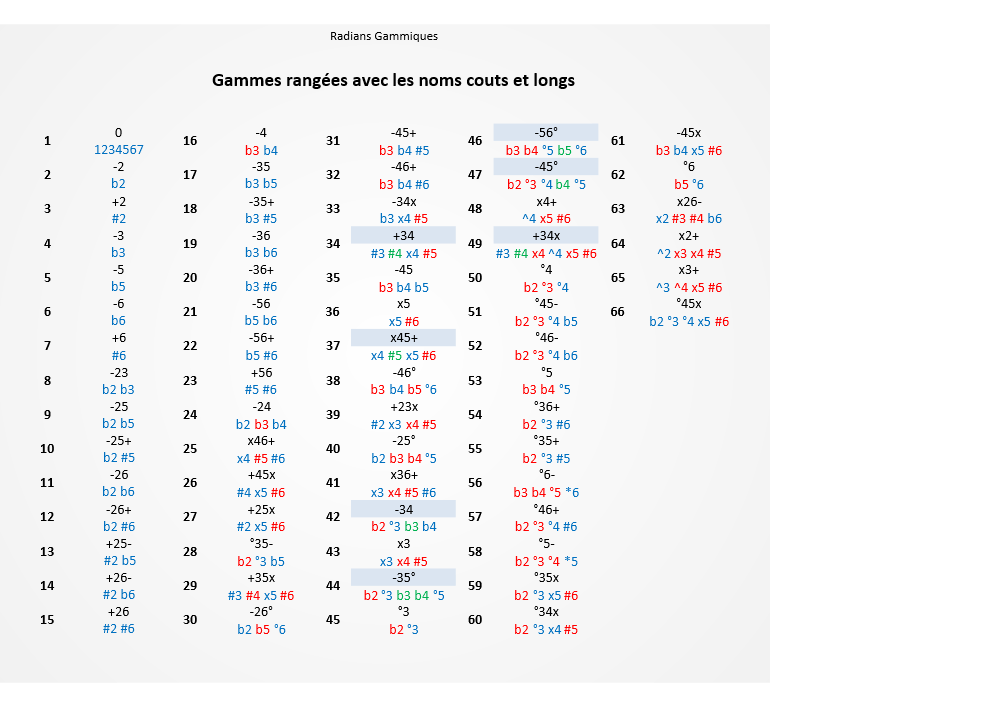 La gamme de DO majeur. Se compose de sept notes, leur développement ajoute sept modes( ou ) degrés : I, II, III, IV, V, VI, VII. I >>>>>>> ionien : I mj7 II >>>>> dorien : II -7 III >>>> phrygien : III -7 IV >>>>>>> lydien : IV mj7 V > mixolydien : V 7 VI >>>>> aéolien : VI -7 VII >>>>>>>> locrien : VII -7b5, ou bien, VII ø7 (demi diminué)