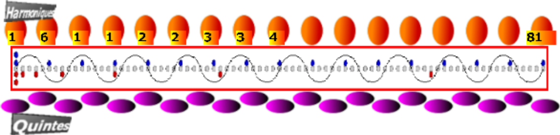 L’échelle harmonique ci-dessus, donne la suite des éléments en séquence. Elle est accompagnée de la série des octaves relatives à l’harmonie fondamentale (qui a justement la même fréquence que l’octave zéro…).