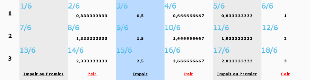 Les cases correspondantes à un alignement vertical, ont toutes les mêmes chiffres décimaux. Il n’y a que la partie entière du chiffre qui est modifié, cette modification intervient à chaque ligne de la table. Aussi, en divisant le n’importe quel nombre entier par 6, on a un chiffre décimal. Dont les décimales sont en correspondance avec une des colonnes verticales de cette table, et ceci est systématique. À savoir ; Seules la première et la cinquième colonne, vont entretenir un lien direct avec les nombres premiers.