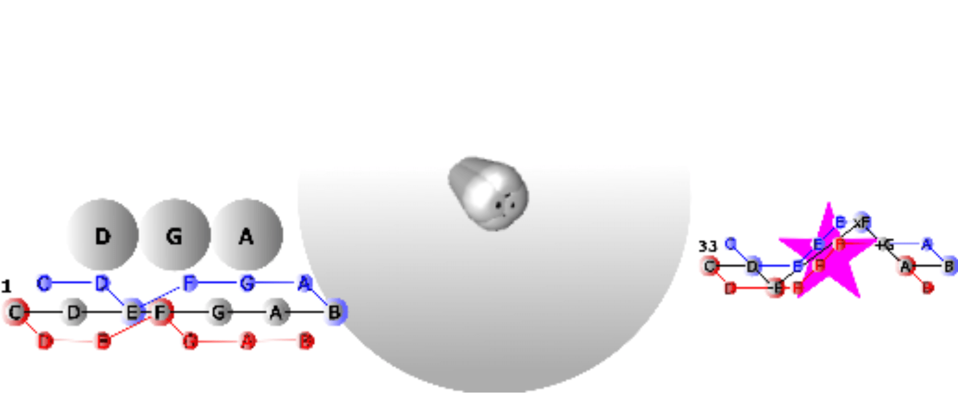 Le classement chromatique selon les degrés, puisqu’il s’agit d’un groupe diatonique, donne différentes tonalités. Aussi, la tonicité des notes sera plus importante au niveau du « noyau ». Ce point de départ des degrés, une attraction relative à une position majeure dans la chronologie des degrés. Nous avons alors plusieurs points d’attractions impliqués, qui créent entre eux un autre effet attractif d’un unième niveau. Une sorte de matière mettant en jeu une surface relative, pouvant attirer les ondes en produisant de la résonance.