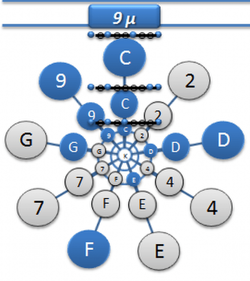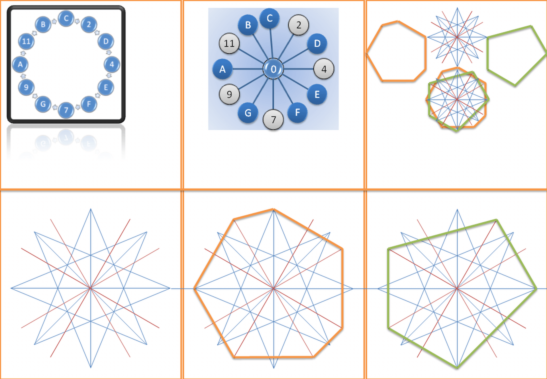 La relativité des formes de base. La gamme naturelle donne une série de deux polygones. Un heptagone pour les notes relatives absolues. Un pentagone pour les intervalles réguliers vides. Tous deux se complètent, et dessinent les vecteurs liés à un rayonnement de douze côtés. (360°/12 = 30°)